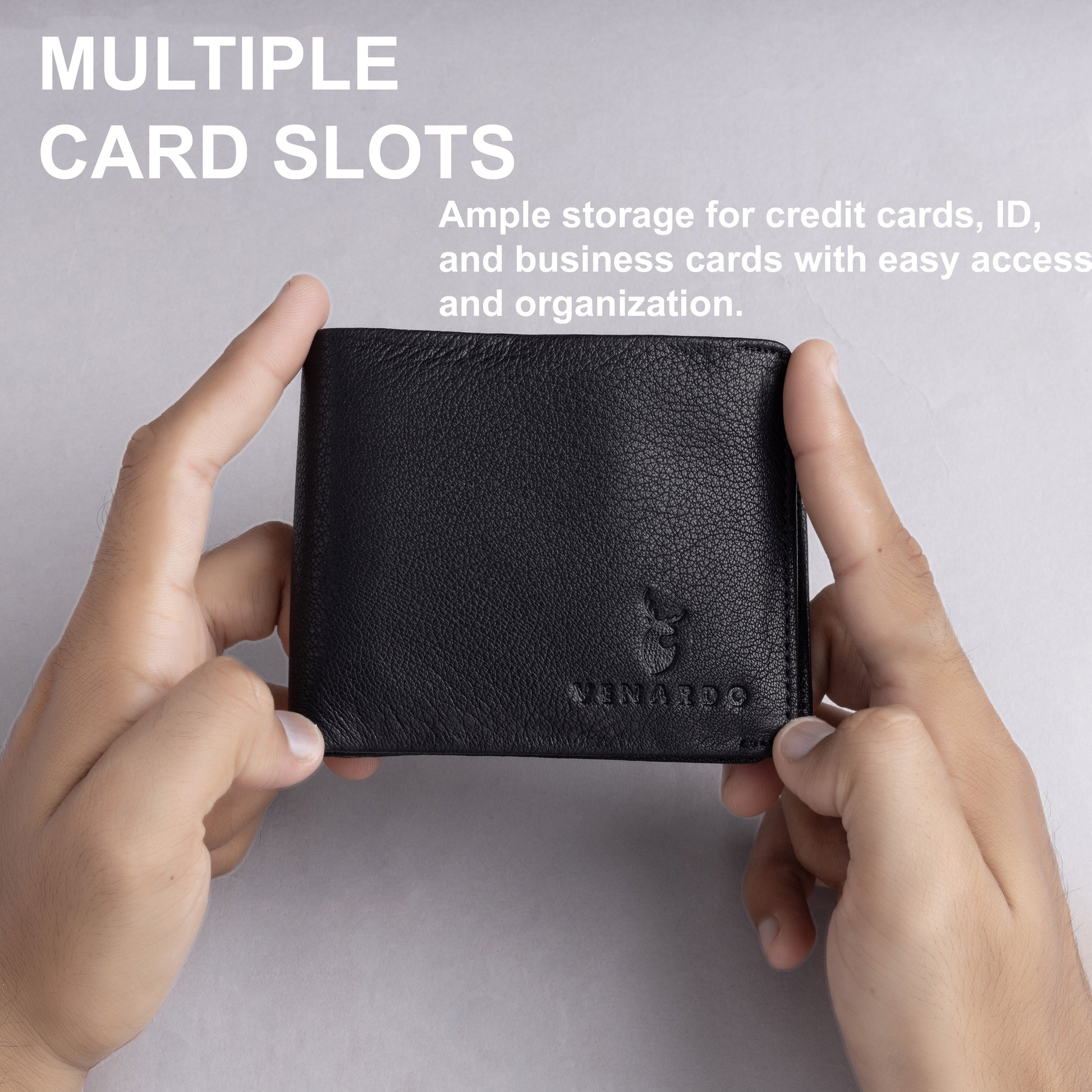 Elevate your accessory game with the Venardo textured black wallet. Crafted from high-quality leather, this sophisticated wallet is designed for the modern man. Its textured finish adds an elegant touch while providing durability for everyday use. With ample space for cards and cash, it seamlessly combines functionality with style. Discover the perfect blend of luxury and practicality that complements your casual style effortlessly.